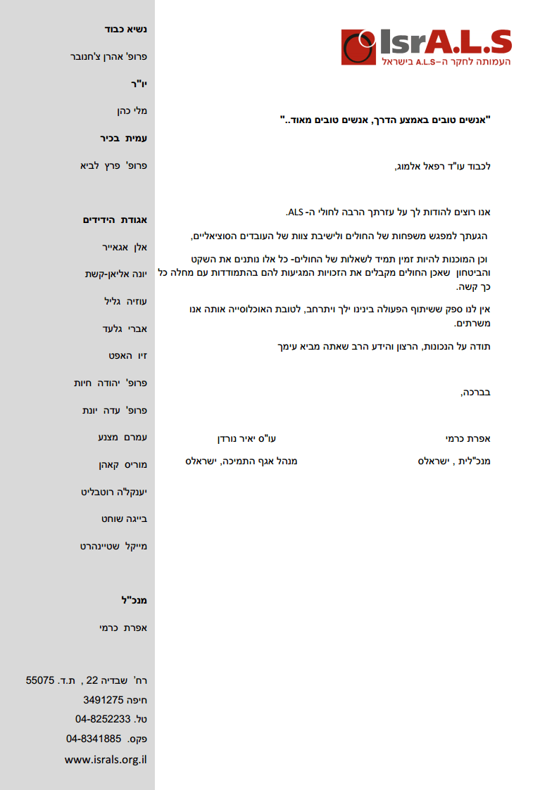 אנו רוצים להודות לך על עזרתך הרבה לחולי ה-ALS .